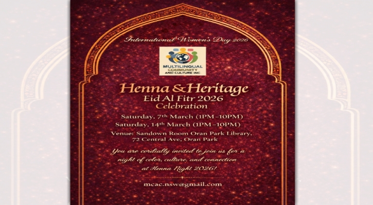প্রতিবছরের ন্যায় এবারও Multilingual Community and Culture Inc . আন্তর্জাতিক নারী দিবস ও ঈদুল ফিতর উপলক্ষে সিডনির ওরান পার্কে আয়োজন করছে বর্ণিল সাংস্কৃতিক অনুষ্ঠান “Henna & Heritage – Eid Al Fitr 2026”। বহুসাংস্কৃতিক ঐতিহ্য, সৃজনশীলতা এবং কমিউনিটি সংযোগ করাই এই বিশেষ অনুষ্ঠানের মূল বিষয়।