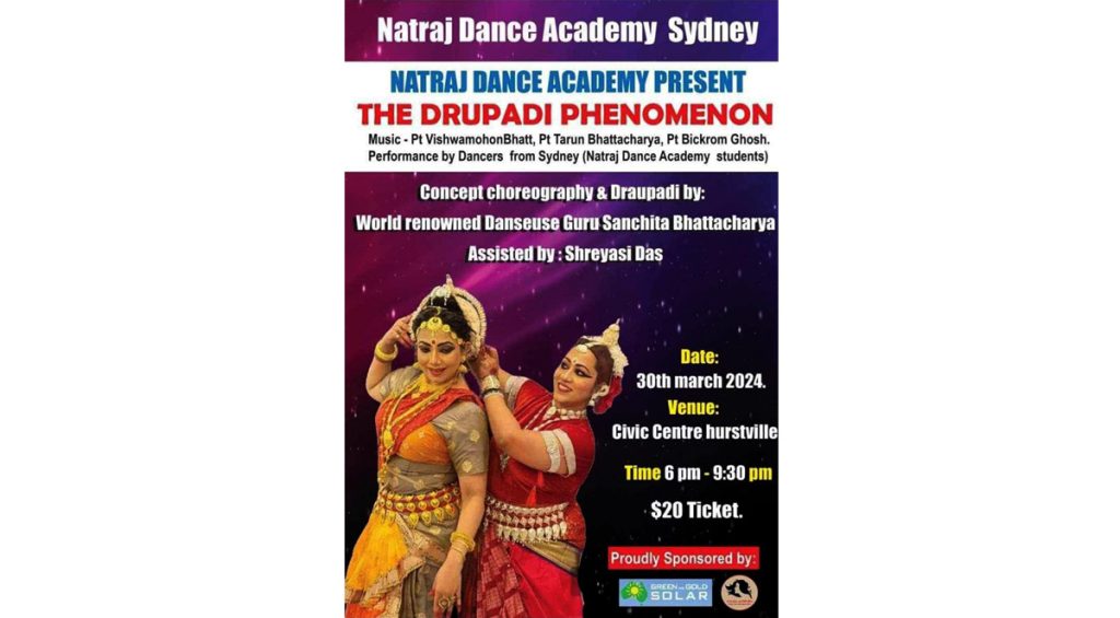 আগামী ৩০ শে মার্চ শনিবার সন্ধ্যা ৬টায় সিডনির হার্সভীল সিভিক সেন্টারে অনুষ্ঠিত হবে “দ্যা ধ্রুপদী ফেনোমেনন”। সিডনি বাঙালি কমিউনিটির বিশেষ পরিচিত নৃত্যশিল্পী ,কোরিওগ্রাফার এবং নৃত্য শিক্ষিকা শ্রেয়সী দাসের নটরাজ ড্যান্স একাডেমীর পক্ষ থেকে এক বিশেষ নৃত্যানুষ্ঠানের আয়োজন করা হচ্ছে ।উক্ত অনুষ্ঠানে ভারত থেকে আগত শ্রেয়সী দাসের নৃত্য শিক্ষিকা শ্রদ্ধেয় গুরুজী সঞ্চিতা ভট্টাচার্য কে শ্রদ্ধাঞ্জলি নিবেদনে করবেন এবং গুরু-শিষ্যের বিশেষ নৃত্য পরিবেশনাও থাকবে।উল্লেখ যে নৃত্যগুরু সঞ্চিতা ভট্ট্যচার্য্যের এই বিশেষ পরিবেশনাটি বিশ্বের বেশ কয়েকটি শহরে অনেক সুনাম কুড়িয়েছে। উক্ত অনুষ্ঠানের টিকিট মূল্য ২০ ডলার।