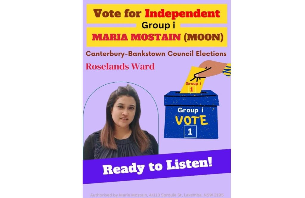 অস্ট্রেলিয়ার নিউ সাউথ ওয়েলস রাজ্যের সিটি কাউন্সিল নির্বাচন আগামি ১৪ সেপ্টেম্বর(শনিবার) অনুষ্ঠিত হতে যাচ্ছে। ক্যান্টারবেরি-ব্যাঙ্কটাউন সিটি কাউন্সিল নির্বাচনে রোজল্যান্ড ওয়ার্ড থেকে স্বতন্ত্র প্রার্থী হিসেবে কাউন্সিলর পদে নির্বাচন করছেন বাংলাদেশি বংশোদ্ভূত মারিয়া মোস্তাইন মুন। তিনি কমিউনিটির একজন সুপরিচিত মুখ।বাংলাদেশী কমিউনিটির সামাজিক সাংস্কৃতিক সকল কাজেই তার অগ্রনী ভূমিকা রয়েছে।এই প্রথম তিনি অস্ট্রেলিয়ার নিউ সাউথ ওয়েলসের স্হানীয় সরকার নির্বাচনে অংশ গ্রহনের মধ্য দিয়ে রাজনৈতিক কর্মকান্ডে কমিউনিটিতে নিজেকে নিয়োজিত করার জন্য নির্বাচনে অংশগ্রহন করছেন।