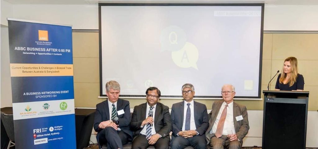 অস্ট্রেলিয়ায় বাংলাদেশ বিজনেস কাউন্সিল (এবিবিসি) “বাংলাদেশ ও অস্ট্রেলিয়ার মধ্যে দ্বিপাক্ষিক বাণিজ্যে বর্তমান সুযোগ এবং চ্যালেঞ্জ” বিষয়ক একটি আলোচনা ও মতবিনিময় অনুষ্ঠানের আয়োজন করেছে। 16 ফেব্রুয়ারী 2024-এ সিডনির পাঁচতারকা হোটেল, হিলটন সিডনিতে অনুষ্ঠিত হয়। ইভেন্টটিতে অস্ট্রেলিয়ায় বসবাসরত বাংলাদেশী ব্যাবসায়ী, শিল্পোদ্যোক্তা, নীতিনির্ধারক এবং ব্যবসায়ী নেতারা দুই দেশের মধ্যে বাণিজ্য সম্পর্ক বাড়ানোর জন্য অনুষ্ঠানটিতে সবাই অত্যন্ত গুরুত্বের সাথে অংশগ্রহণ করেন।