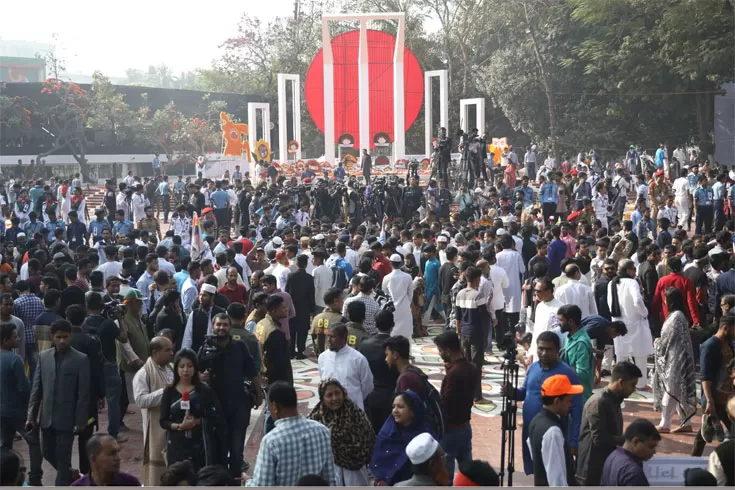 কেন্দ্রীয় শহীদ মিনার প্রাঙ্গণে বেজে চলেছে অমর একুশের গান। ভাষা শহীদদের প্রতি গভীর শ্রদ্ধা জানাতে হাতে ফুল, কালো পোশাক, ব্যাজ ধারণ করে ধীর পায়ে এগিয়ে চলেছেন অসংখ্য মানুষ। একে একে তারা শহীদদের প্রতি ফুল দিয়ে শ্রদ্ধা জানাচ্ছেন।