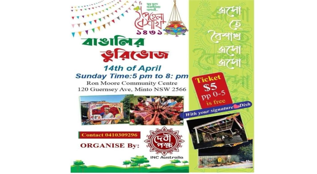 সিডনি মিন্টোর রনমোর সেন্টারে আগামী ১৪ এপ্রিল রবিবার দেবীপক্ষ এইবার দ্বিতীয় বারের মত আয়োজন করতে যাচ্ছে পহেলা বৈশাখের বিশেষ উৎসব বাঙালির ভুড়িভোজ।আর এই আয়োজনের বিশেষত্ব হলো এখানে থাকবে বাংলাদেশের ৬৪ জেলার ৬৪ রকমের খাবার ।এছাড়াও থাকবে মনোজ্ঞ সাংস্কৃতিক অনুষ্ঠান, ফটোসেশন, আড্ডা আর সাজগোজের বাহার।বিকাল ৫:০০ টা থেকে রাত ৮:০০ পর্যন্ত চলবে এই উৎসব।দেবীপক্ষের কর্নধার জুঁই সেন পাল জানান,” একটু ব্যতিক্রম কিছু করার জন্যই ৬৪ জেলার ৬৪ রকমের খাবার রাখার পরিকল্পনা করেছেন তিনি।সবারই নিজ নিজ জেলার খাবারের প্রতি একটা বিশেষ দূর্বলতা থাকে আর তাই সবাই যেন তার নিজের এলাকার খাবারটা সবাইকে খাওয়াতে পারে তাই এই প্রচেষ্টা।”