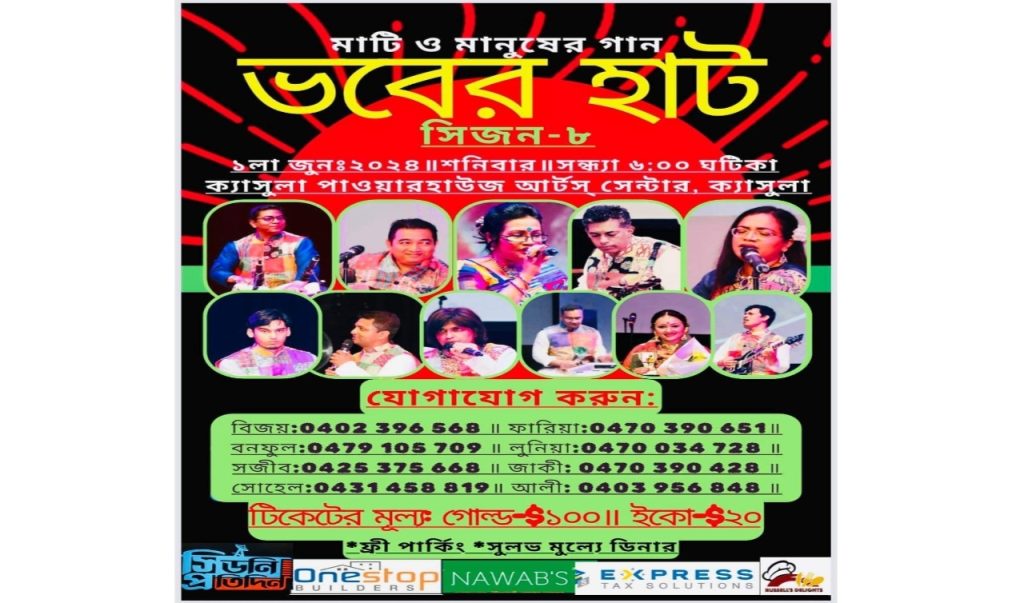 ॥ভবের হাট: সিজন-৮॥ তারিখঃ ১লা জুন ২০২৪,শনিবার সময়ঃ সন্ধ্যা ৬:০০ ঘটিকা স্হানঃ ক্যাসুলা পাওয়ারহাউজ আর্টস্ সেন্টার।