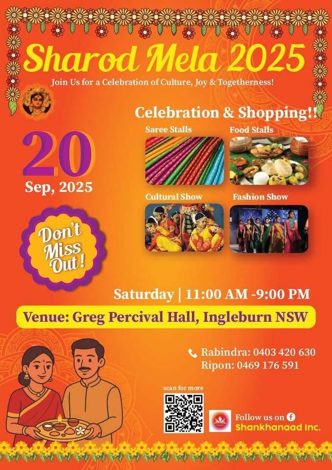 সিডনির ইঙ্গেলবার্নে আগামীকাল শনিবার অনুষ্ঠিত হতে যাচ্ছে শঙ্খনাদ আয়োজিত শারদ মেলা। সকাল ১১টা থেকে রাত ৯টা পর্যন্ত স্থানীয় গ্রেগ পারসিভাল হলে চলবে এই দিনব্যাপী বর্ণিল আয়োজন।