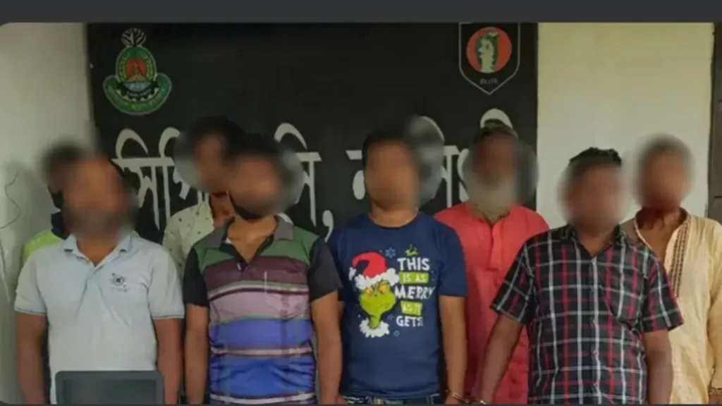 গ্রেফতারকৃহলো ১। মোঃ শফিক মিয়া (৩২) পিতা মোঃ ডালিম মিয়া ২। মোঃ মোস্তফা (৩৮) পিতা মৃত হাজী সামছুল মিয়া ৩। জাহিদ হাসান (১৭) পিতা মোঃ দুলাল মিয়া ৪। আয়নাল (৩৮) পিতা মৃত মহাজুদ্দিন ৫। মহিউদ্দিন হৃদয় (২২) পিতা মোঃ জাকের হোসেন ৬। মোঃ বাচ্চু মিয়া (৬২) পিতা মৃত আলী হোসেন ৭। কালু মিয়া (৬৯) পিতা মৃত আঃ সামাদ (টুক্কু) মিয়া এবং মোঃ বাছেদ (৪০) পিতা মৃত খলিল রহমান। সকলের বাড়ী রায়পুরা উপজেলার চরাঞ্চল সায়দাবাদে।