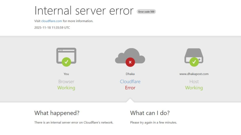 বাংলাদেশসহ বিশ্বজুড়ে ব্যবহারকারীরা যখন এই সাইটগুলোতে প্রবেশের চেষ্টা করেন, তখন বলা হয়- ‘ক্লাউডফ্লেয়ারের নেটওয়ার্কে অভ্যন্তরীণ সার্ভার ত্রুটি দেখা দিয়েছে। কয়েক মিনিট পর পুনরায় চেষ্টা করুন।’